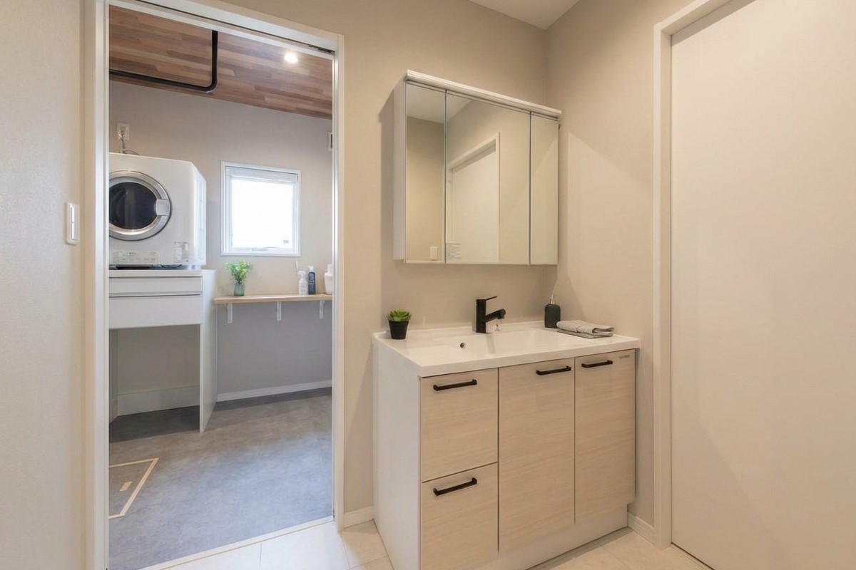 朝の「使うタイミング」が重なっても大丈夫。誰かがお風呂に入っていても気兼ねなく使える、家族みんなに優しい設計。(イメージ)