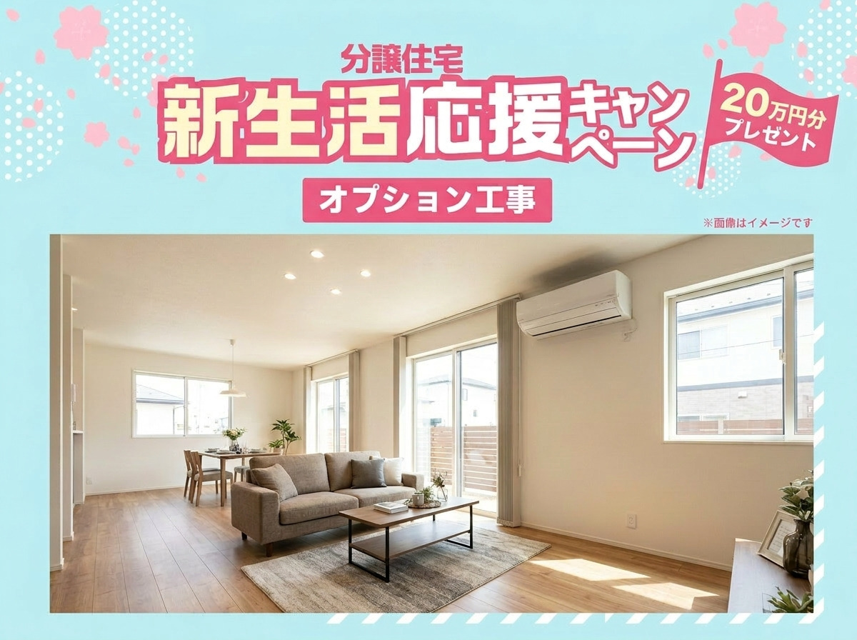 新生活応援キャンペーン20万円で、合計最大100万円分の補助金・特典をご活用いただけます! 省エネ仕様で環境にやさしく、家計にもやさしい分譲住宅を、このお得な機会にぜひご検討ください。 まもなく締め切ります!詳細はお気軽にお問い合わせください。