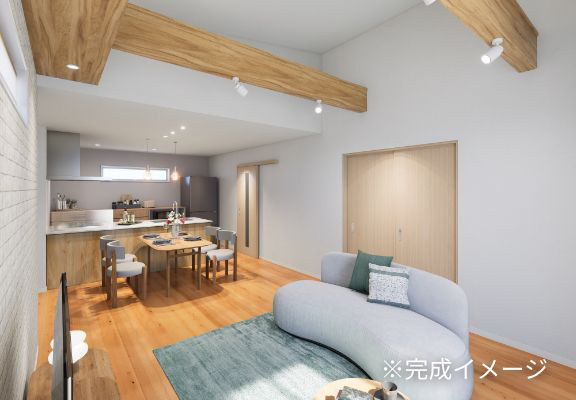 20.5帖の広々としたLDK。勾配天井とワイドサッシで明るく開放的な雰囲気を演出します。