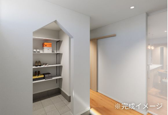 広々としたシューズクロークと空間にほどよいリズムが生まれる、丸みのある優しいデザインの家具を採用。白と木目を組み合わせて北欧風に仕上げました。