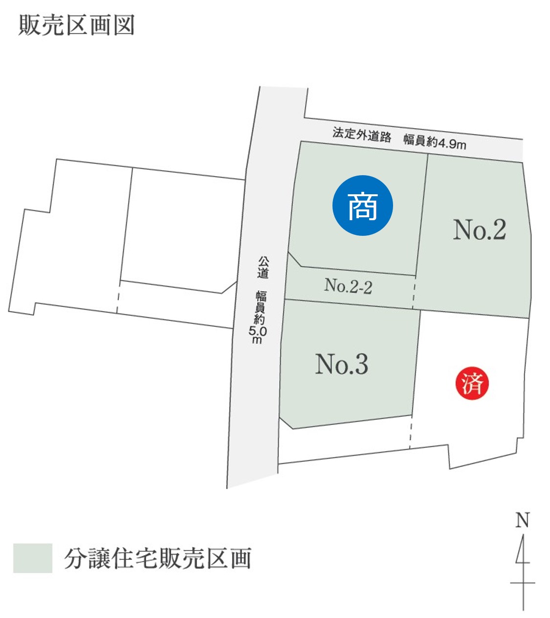 備考雨水管道路占用有 前面道路7時-8時(土日除く)歩行者専用のため通行許可要 分譲地北側は法定外道路(幅員4.9m) No.2うち進入路48.64㎡含、No.4うち進入路51.33㎡含、No.6別途進入路44.14㎡有