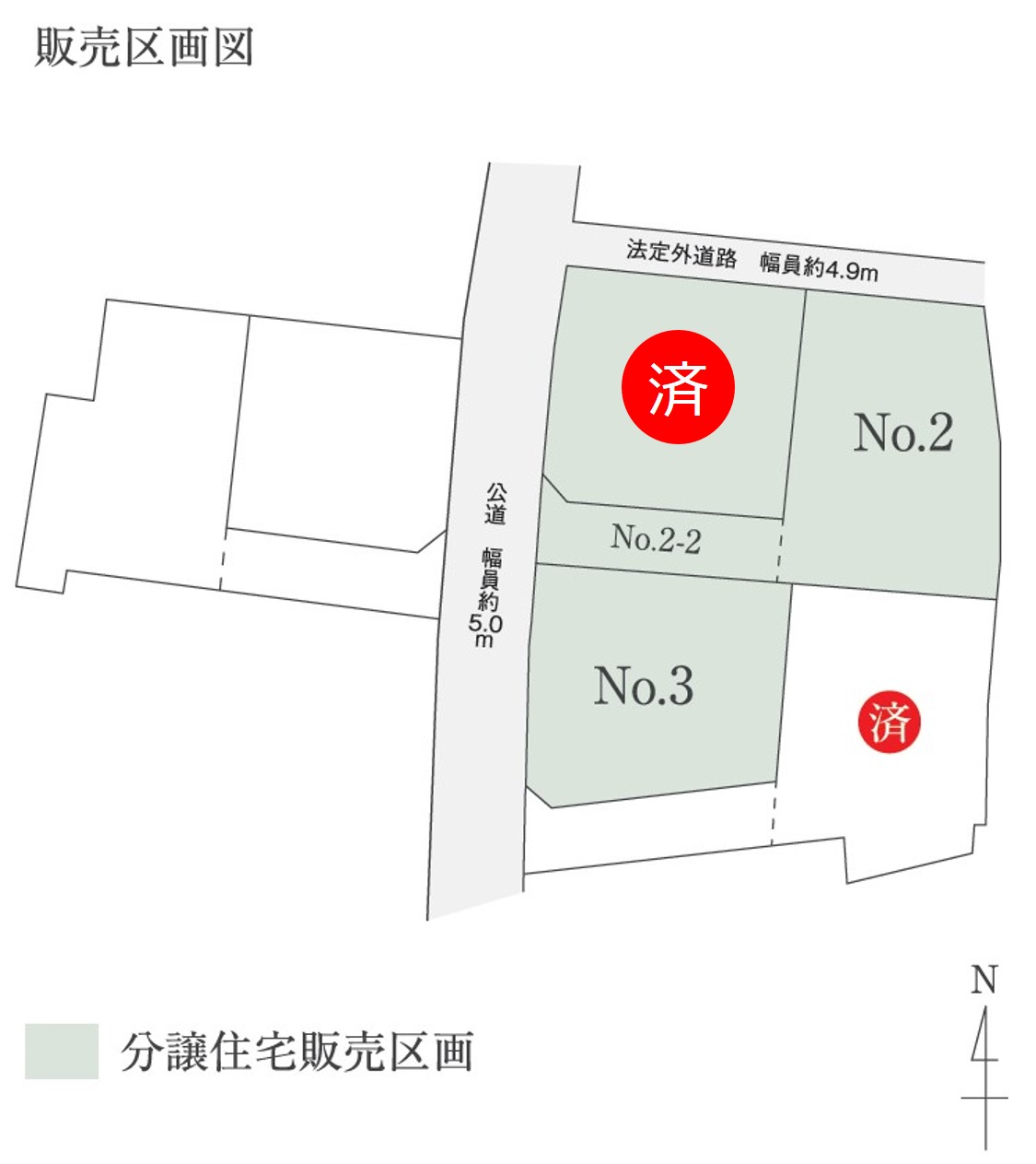 備考雨水管道路占用有 前面道路7時-8時(土日除く)歩行者専用のため通行許可要 分譲地北側は法定外道路(幅員4.9m) No.2うち進入路48.64㎡含、No.4うち進入路51.33㎡含、No.6別途進入路44.14㎡有